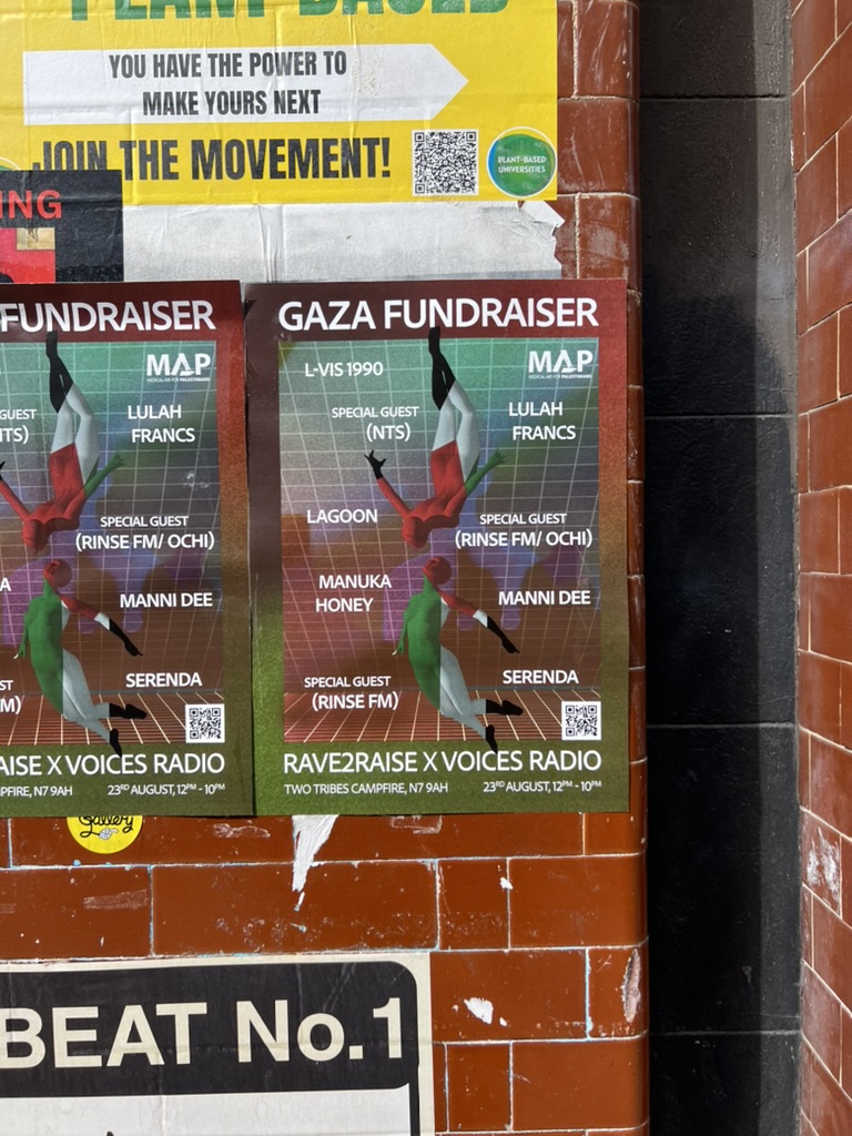 今回の旅では、どこに行っても数歩歩けば「Free Palestine」の文字が見つかった。「GAZA FUNDRAISER」と書かれたのは、ガザに募金するために一日中開催されたレイヴのお知らせ。Rave2Raiseという団体がVoices Radioと共に行っていて、これまで£14174(280万円くらい)寄付したそう。元労働党党首であるジェレミー・コービンも支持を示している(Jeremy Corbyn backs Rave2Raise event for Gaza with Manuka Honey, L-Vis 1990, Manni Dee, more)。コービン氏は、反移民を掲げる右派ポピュリスト政党「リフォームUK」に対抗する選択肢をつくるため、新党をつくろうとしているそうだ。8月には原水爆禁止世界大会に参加するために日本に訪れ、共産党の志位さんと話していた。