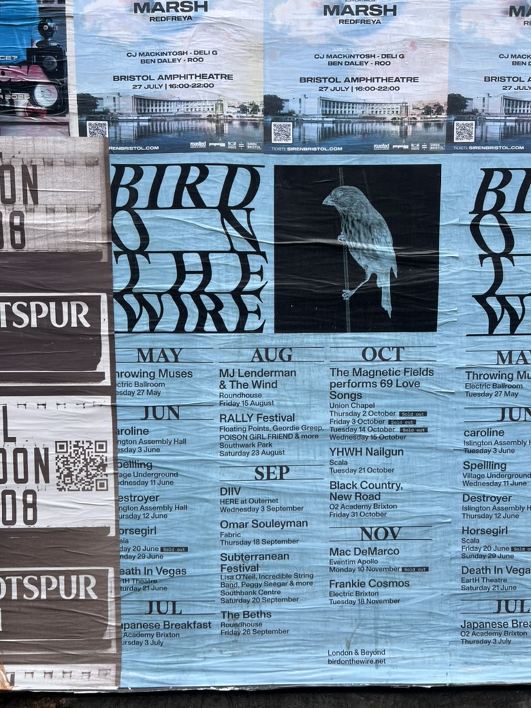Whitechapelから少し歩けばストリートアートで溢れ、古着屋などもたくさんあるShoreditchもある。ここからここはこう、と区切られているわけではなく、なだらかに繋がっていて、いろんな顔を覗かせる。ちょうど、BIRD ON THE WIREの広告が貼られていた。8月のところに、今週行く予定のRALLY Festivalも書かれている。本当はMJ Lenderman & The Windのライブも行きたかった!