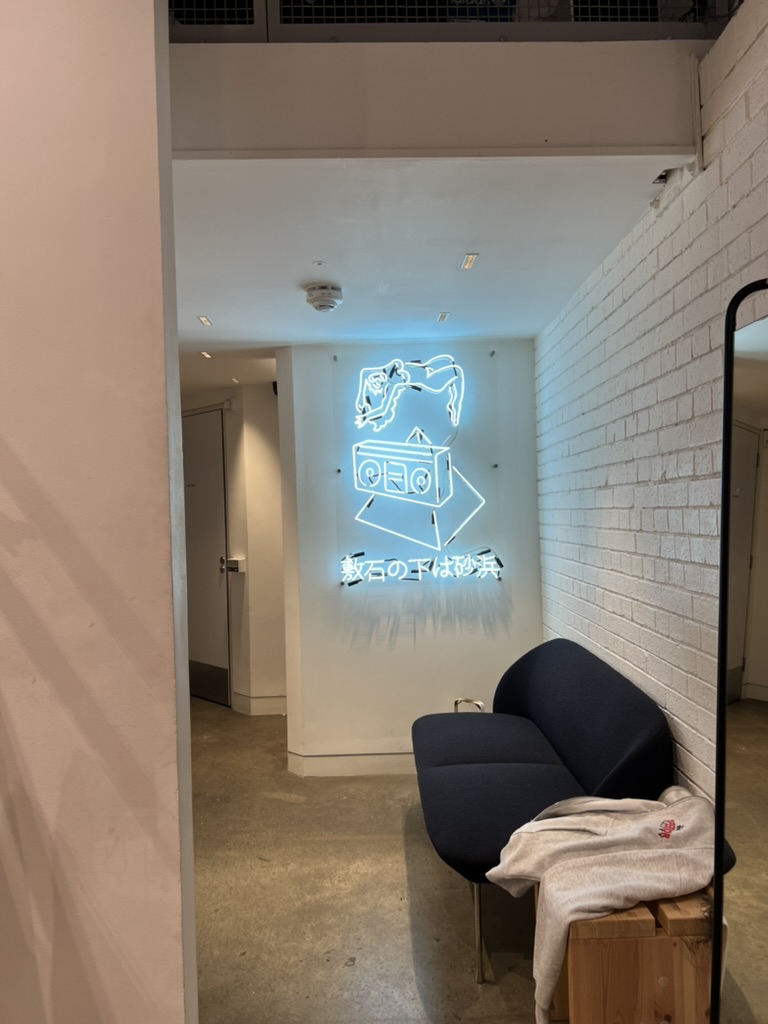 GOODHOODというセレクトショップにふらりと入ったら、ネオンのオブジェに「敷石の下は砂浜」と日本語で書かれていた。五月革命のスローガンがなぜか日本語で書かれている。あちこちで日本語を見かけた。Superdry(極度乾燥しなさい)は知っていたけど、こんなにもあるのか。